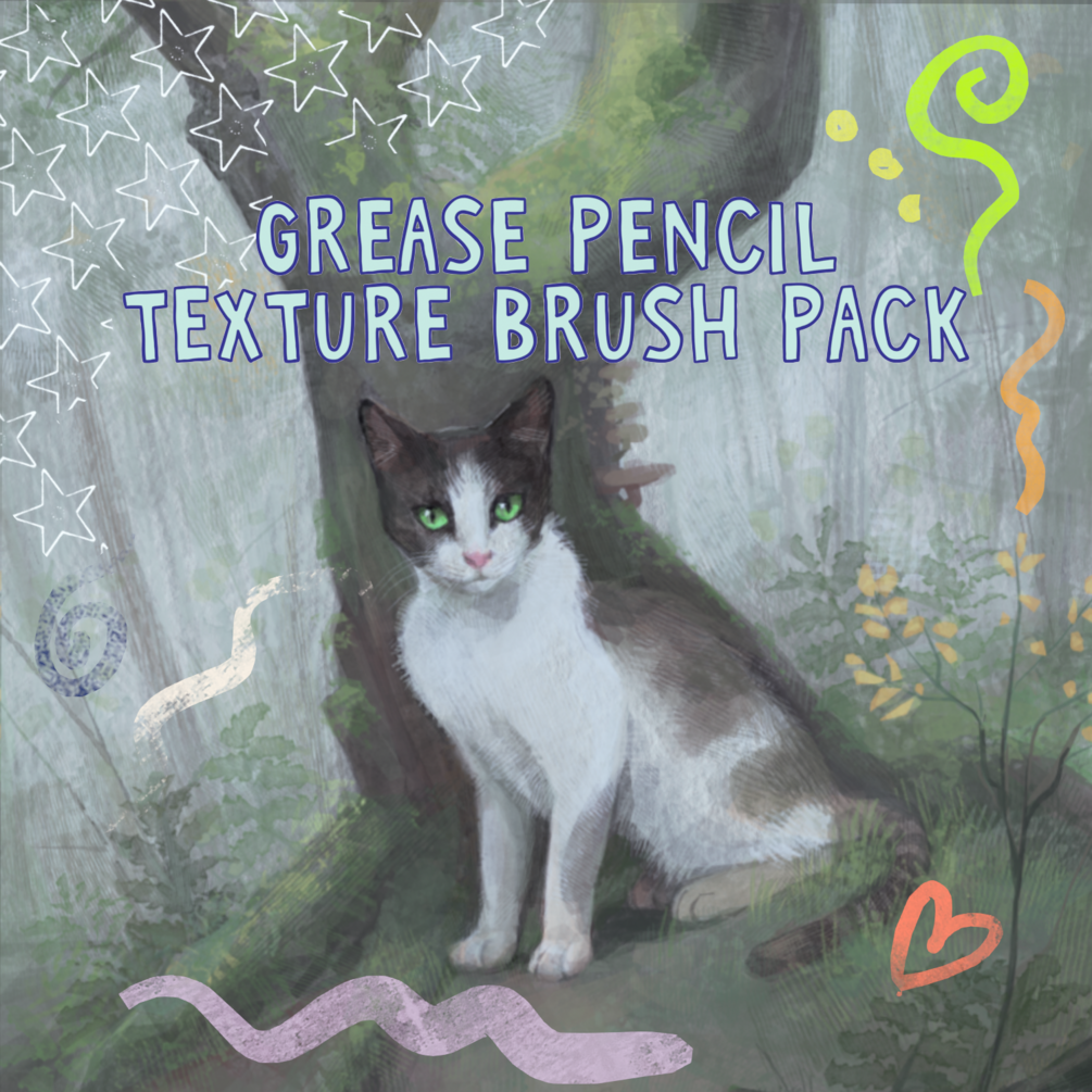 This pack contains 56 brushes for Blender grease pencil. Each brush contains a different repeating texture- either made from real ink and watercolour textures, or a digital pattern.