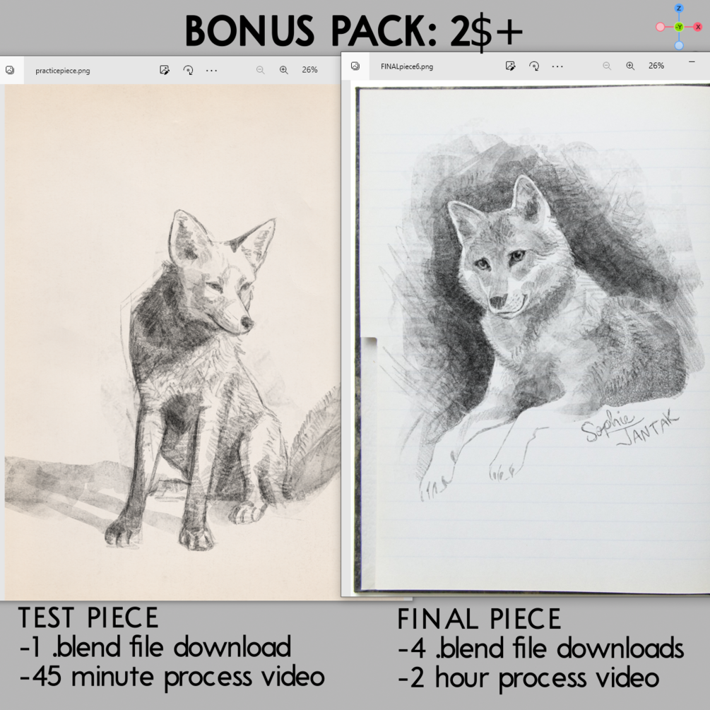 The bonus pack contains the .blend files and realtime process videos of these two artworks, created using these brushes.